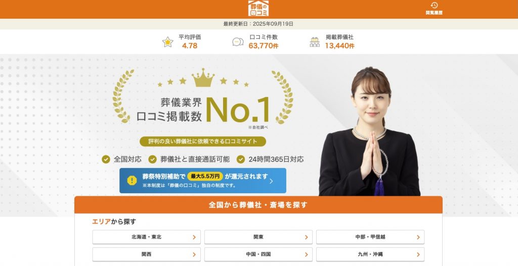 「葬儀の口コミ」は、全国の葬儀社と利用者をつなぐ、日本最大級の葬儀社検索・口コミサイトです。50,000件以上の口コミを比較し、評判の良い葬儀社に依頼できます。