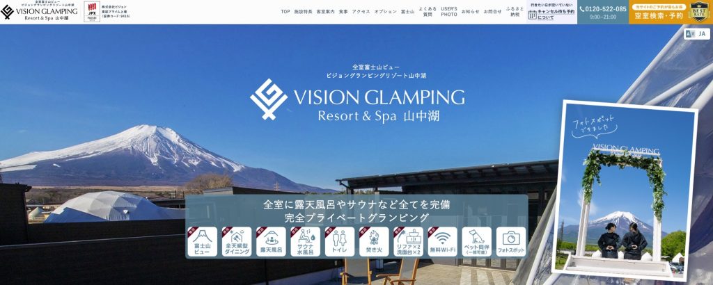 全室に露天風呂や貸切サウナなど全てを完備した、富士山ビューの完全プライベートグランピング施設。ペットの受け入れ可能なお部屋もご用意しています。