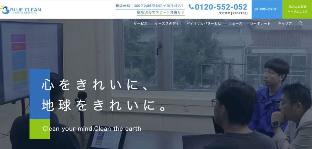 ブルークリーンは、「心をきれいに、地球をきれいに。」を理念に掲げ、独自の高度清掃技術〈バイオリカバリー〉を展開する専門企業です。